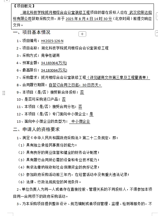 湖北科技學(xué)院攬?jiān)聵蔷C合會(huì)議室裝修工程競(jìng)爭(zhēng)性磋商公告